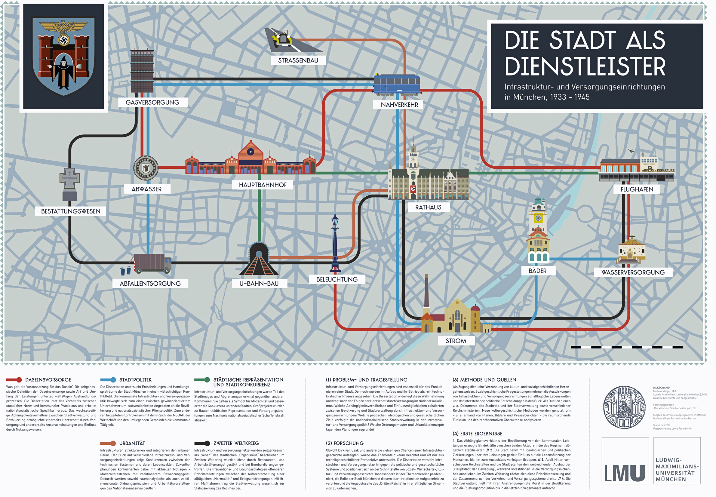 Das Dissertationsvorhaben greift dieses Desiderat auf und widmet sich den kommunalen Infrastruktur- und Versorgungseinrichtungen in München in der Zeit des „Dritten Reichs“. Anhand einer Verzahnung von kultur- und sozialgeschichtlichen Herangehensweisen werden Spezifika des Nationalsozialismus in der Infrastrukturpolitik herausgearbeitet. Welche Angebote den Bürgerinnen und Bürgern gemacht wurden, also das, was als Voraussetzung für ihr Dasein angesehen wurde, war nie statisch abgesteckt, sondern unterlag Aushandlungsprozessen. Die Entscheidungen wurden selten in nur einer Behörde, sondern in Kooperation und Konkurrenz zwischen öffentlichen Ämtern und Parteistellen auf lokaler und nationaler Ebene sowie in Zusammenarbeit mit Experten getroffen.